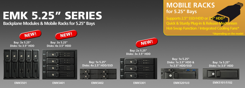 Five slots for 3.5” SATA/SAS HDD. Installation in three 5.25” bays.