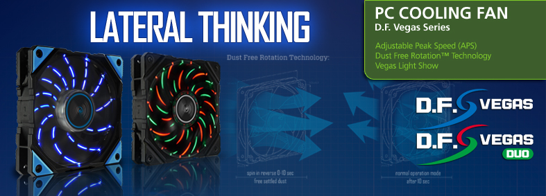 The patented DFR™ technology allows the D.F. Vegas and D.F. Vegas Duo to remove automatically the dust from the fan blades. After starting the PC, the fan spins in reverse at full speed removing the dust. After that it will shift back to the normal operation mode.